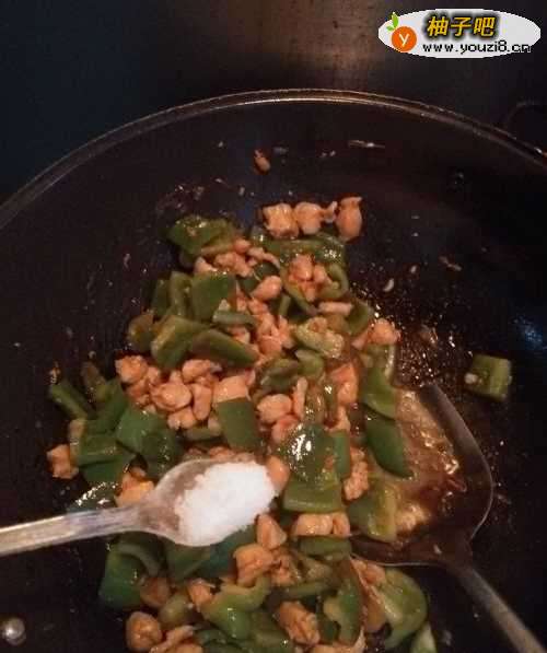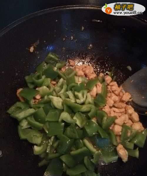 6鸡肉炒至八成熟后,将辣子丁倒入锅中,和鸡肉一起炒。