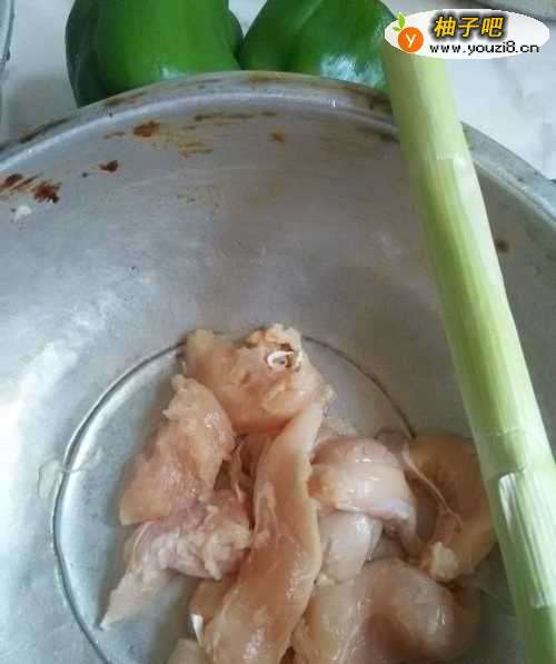 将辣子洗净,鸡小胸用水洗一下,控干,再准备葱。将鸡肉切成小丁,辣子也切成丁。葱切成片。