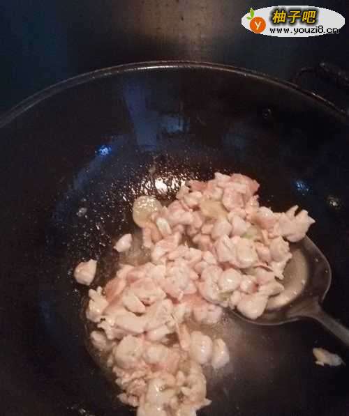 3将鸡丁放入锅中,用铲子快速翻炒,炒至鸡肉成白色。