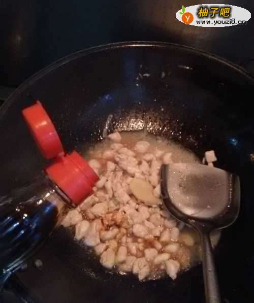 4在锅中放入适量的酱油,增加鸡肉的香味和颜色。