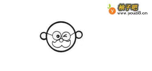 5第5步,这一步我们把老人的两只耳朵画出来,上面我们把眼镜儿的两个横梁都画出来了,我们知道眼镜的横梁是挂在耳朵上的,所以在这两个线的末端画两个小圆,表示老人的耳朵,