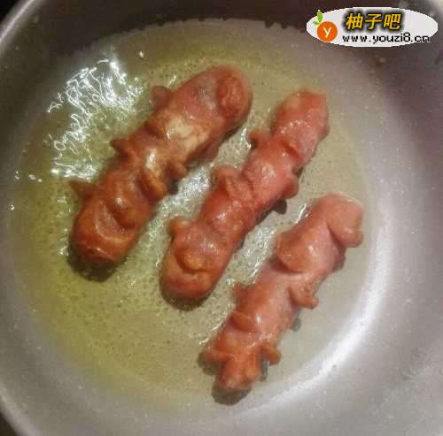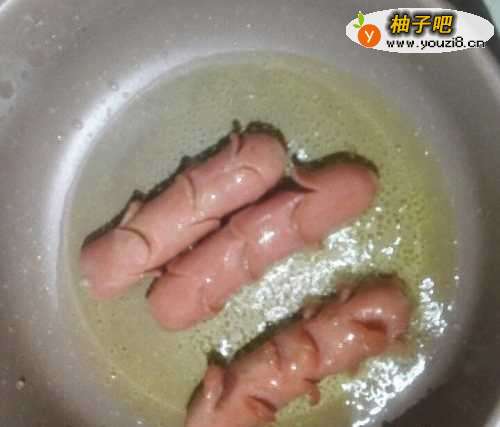 3锅中倒入适量的油,小火烧热后,放入火腿肠。