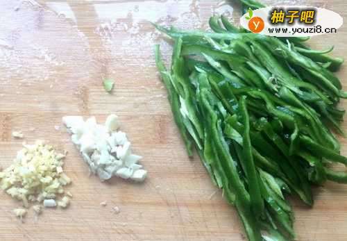 3青椒去蒂和白色的筋,洗净切成细丝,大蒜、生姜切成碎末