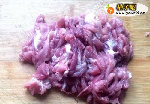 2猪肉洗净切成筷子粗细的丝,放到碗里加入少许盐、醋、料酒、老抽、白糖、生粉拌匀腌渍10分钟左右