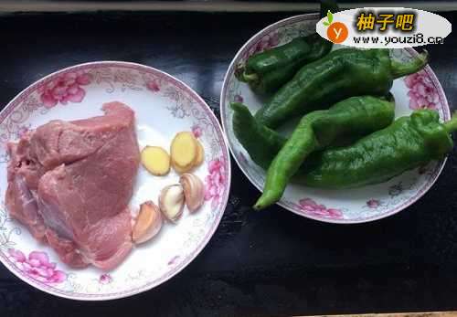 首先准备好食材,猪瘦肉300g,青椒5个,生姜3小片,大蒜3瓣