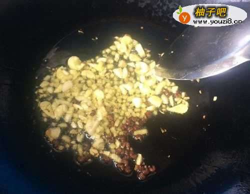 4锅内放少许菜籽油,中火七成热后依次放入花椒、生姜大蒜,翻炒一下,然后放入肉丝快速翻炒