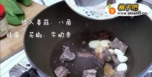 5冷油放入姜蒜,八角,桂皮,花椒,煸炒出香味,放入焯水过的牛肋条一起煸炒