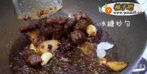 6煸炒至牛肋条微焦黄色时,放入沙茶酱,辣椒酱,冰糖一起炒匀