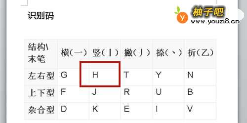 为识别码,【拥】字为左右结构,末笔为【撇丿】,对应键为【H】。