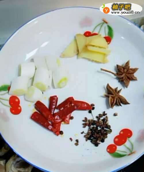 5第五,把葱切成葱段,姜切成姜片,同时取适量的花椒,八角,干辣椒一同放到锅里翻炒,量如下图所示: