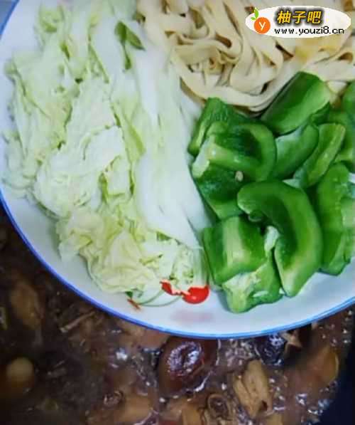 9第九,把白菜洗净切块,豆皮切丝,虎皮辣椒洗净切块,在20分钟以后,打开锅盖,把这些配菜一同放到锅里,如下图操作: