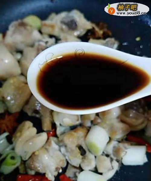 7第七,不停用锅铲翻炒,直到鸡肉上色,在加入适量的水,水最好莫过鸡肉,水开以后,加入适量的盐,鸡精,白糖,十三香,具体操作和用量如下图: