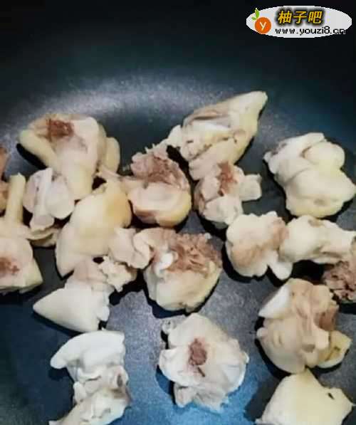 4第四,取一个干净的锅,加热,然后把鸡块倒入锅里翻炒,同时在加入一勺食用油,具体量如下图所示: