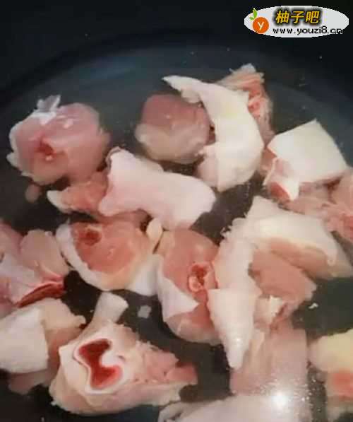 2第二,锅里放水加热,把切好的鸡块倒入水里,在水快开的时候,加入一小勺食用油,如下图: