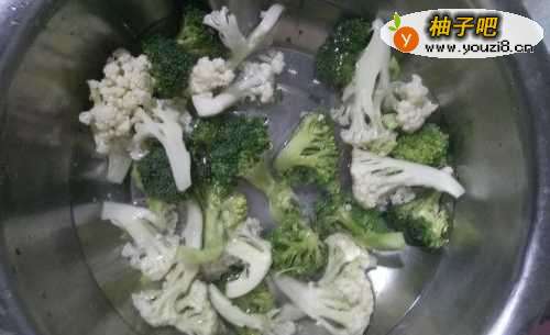 3将西兰花和花菜切好,洗净,放入锅里,加水煮到八成熟后捞出沥干水分;