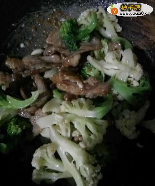 5将西兰花和花菜也下入锅里,一起翻炒;