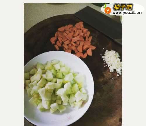 首先黄瓜洗净,削皮(担心有农药残留的厨友们,可以用盐浸泡或削皮)火腿肠和黄瓜都切成丁状或片状,蒜瓣切成蒜蓉准备。