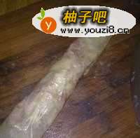 5整大张豆腐皮分割后,平放砧板上,在上面抹点水后,码入拌好的配料,卷成圆