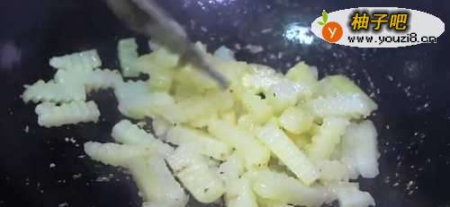 3捞出土豆,沥干水。在锅中倒入适量油,将土豆绞倒入锅中加入适量食盐翻炒。