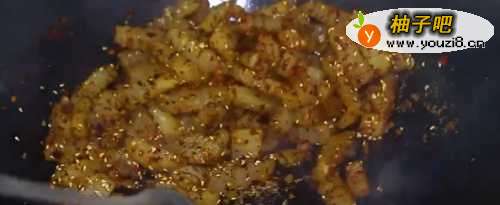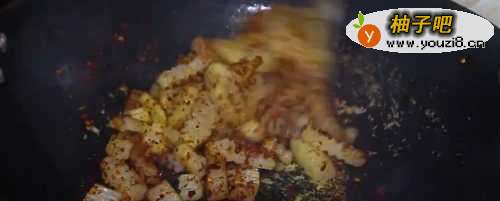 4再加入辣椒粉、花椒粉后继续翻炒。
