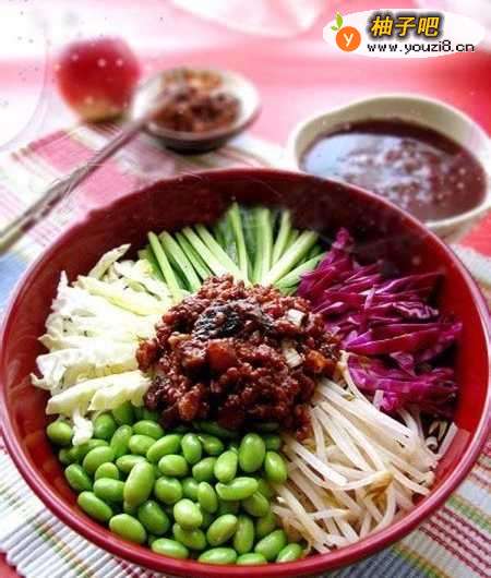 6汉族面食。流行于北京 、河北,天津等地,由菜码、炸酱拌面条而成。将黄瓜、香椿、豆芽、青豆、黄豆切好或煮好,做成菜码备用。然后做炸酱,将肉丁及葱姜等放在油里炒,再加入黄豆制作的黄酱或甜面酱炸炒,即成炸酱。面条煮熟后,捞出,烧上炸酱,拌以菜码,即成炸酱面。也有面条捞出后用凉水浸洗再加炸酱、菜码的,称 “过水面”。