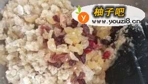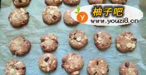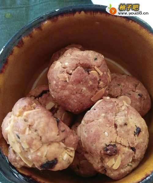 6还有干粉的时候就加入葡萄干,接着翻拌戳戳20下左右就基本没有干粉了。预热烤箱190到200℃,戴上一次性手套开始搓球,大概15克一个。顺便可以在每颗球表面粘点杏仁片