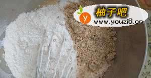 5把面粉和坚果颗粒一起倒进去糖油蛋混合物,用刮刀稍微翻拌,面粉不用过筛,就是这么随性~ 这个时候可以加入25克奶粉或者椰浆粉代替等量面粉,增加香气~
