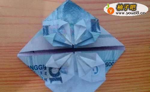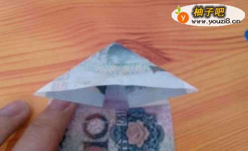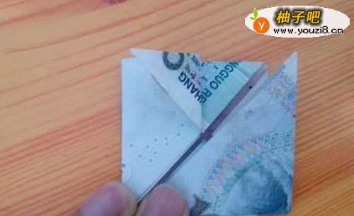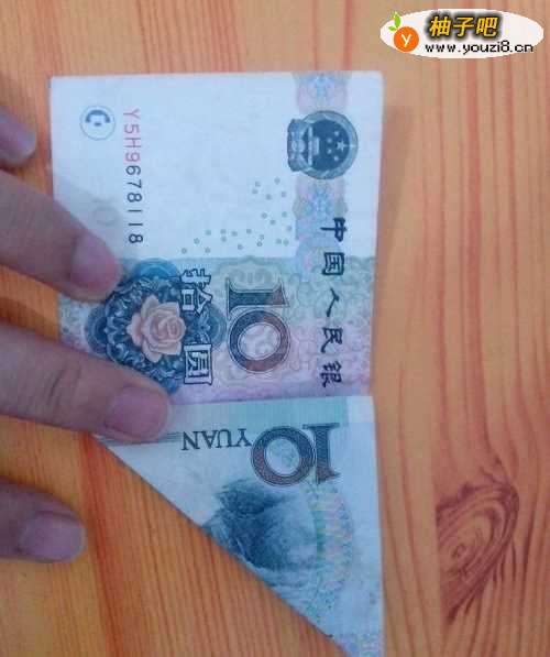 10元纸币一角折叠45度,打开后。同样的方法折,叠另宁一角,打开。如图所示