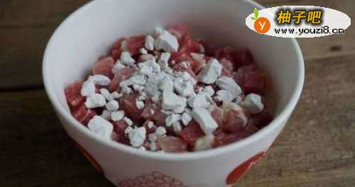 2瘦肉切成小丁,放入少许红薯淀粉,盐,胡椒粉,腌制上浆