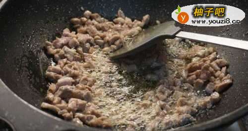 4锅里放入少许油,油温6成热的时候倒入腌制后的肉丁滑散