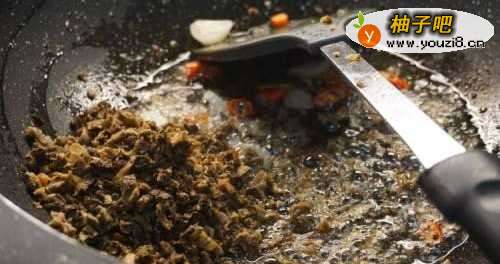 7然后倒入放入切碎的自制芽菜末继续炒香