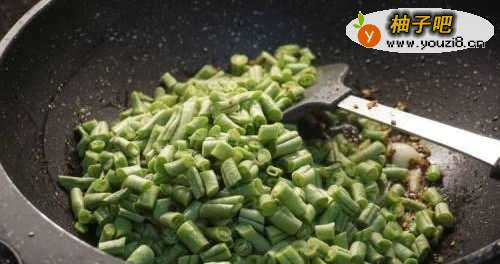 8倒入切成段的四季豆,干煸到四季豆起皱