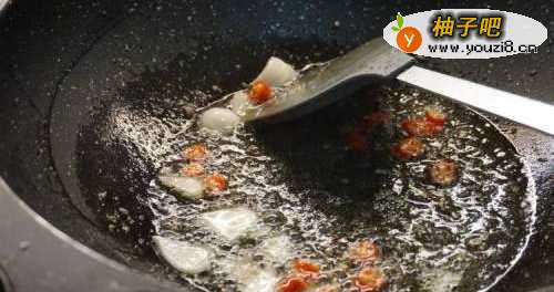 6锅里留底油,放入小米辣椒段,蒜片爆锅炒香