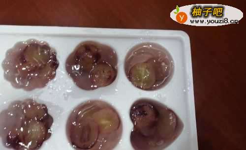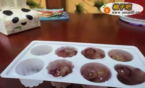 5将切好的葡萄放入模具中,浇入刚刚熬好的汁。若没有模具,家中小碗也可代替。