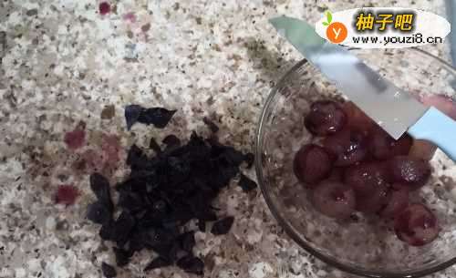 2将葡萄洗净,去皮去籽,切成两半盛入碗中。