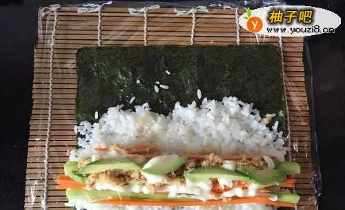 4将拌过寿司醋的米饭平铺在海苔上约2/3面积,将所有食材的1/4用量逐一放在米饭前段靠自己的位置,最好是放一次蔬菜挤一点色拉酱,这样寿司会比较入味。第一次做食材拿捏不准可以少放一些,以免太鼓囊了包不起来。