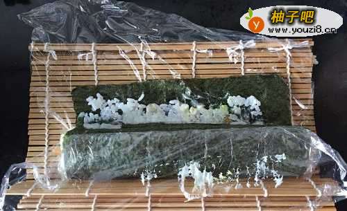 5拎起竹帘将食材卷入。这里是最难的地方,要注意①一定要用竹帘将饭团压紧实了并捏圆,左右两边有食物被挤出就用勺子塞回去;②保鲜膜不要卷进去。最后在上端抹少许米饭将整个寿司卷包圆实了即可。