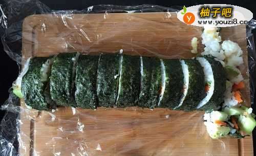 6切寿司卷要注意:①每切一刀用湿抹布把刀面擦干净,这样比较容易切;②下刀不要太快,慢慢地切下去,保持海苔截面的平整;③第一刀切下来的寿司卷会散开来,没关系后面就好看了。