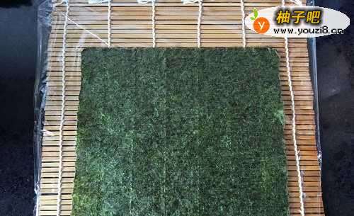3在竹帘上铺一张保鲜膜以防沾粘,取一张海苔平铺于上面。