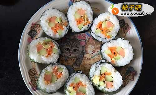 寿司卷配菜很随意,挑自己爱吃的,多放点色拉酱,然后米饭海苔卷一卷就很美味。难点就在于卷的紧实,切得整齐。小厨尽量把要领描述清楚,希望大家都能做出漂亮的寿司卷。