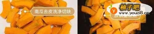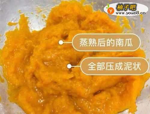 2蒸熟后的南瓜用勺子一压就变成泥了哈~把南瓜全部压成南瓜泥
