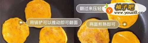 5热锅后锅里下少许油(不粘锅可以连油也不下,但一定要热锅,把搓好的南瓜饼放入,一面煎至可以推动即可,翻过来,用锅铲稍微轻轻压扁一下,继续两面煎熟即可