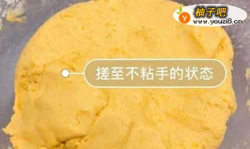 3趁南瓜还热的时候迅速加入糯米粉(糯米粉分次加入)一边加一边搓面团,搓至不粘手就可以