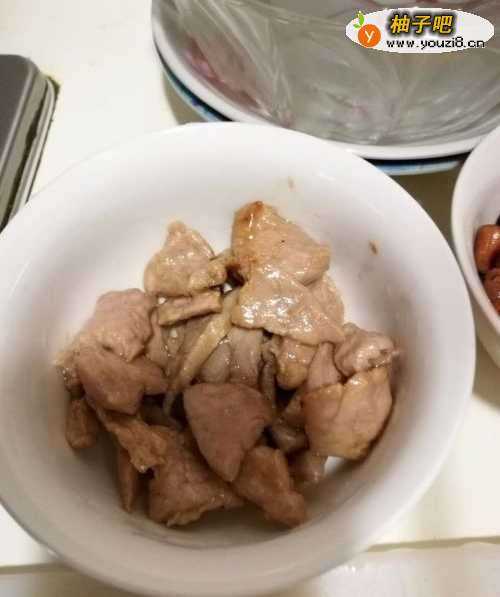 肉切片,放入生抽,糖,盐,生姜腌制10分钟左右。锅里放油烧热,倒入腌好的肉片翻炒,炒熟备用。