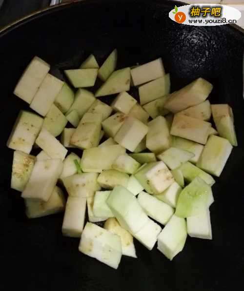 4倒入茄子块翻炒,加入糖,生抽继续翻炒。