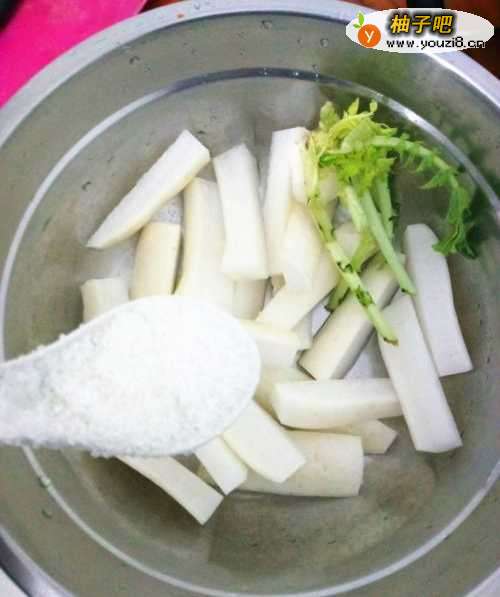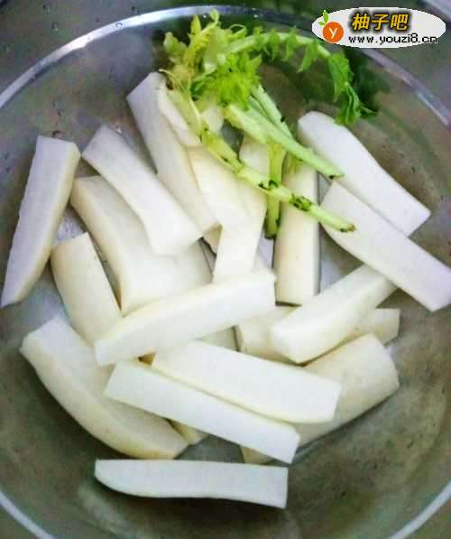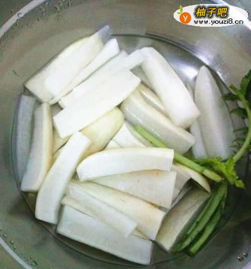2将萝卜切条,差不多2厘米粗,每一块肉上面都必须带有萝卜皮,如果细了或是没有皮,腌制后的脆度就不够了。
