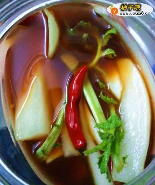 6最后把酱水和萝卜一起放进玻璃瓶或是其它可以密封的容器,水要淹过萝卜即可,密封容器,放进冰箱,等待三四天就可以吃了,不放冰箱也可以,但是容易太酸,放进冰箱会更加爽口哦。