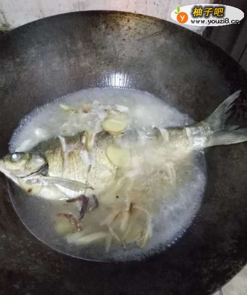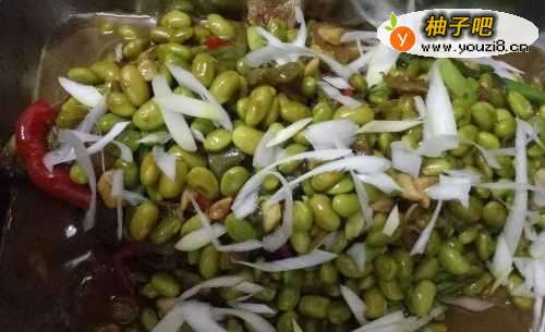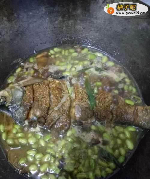 6煮到水剩一半时,把鱼翻过来,加入毛豆继续煮3~5分钟