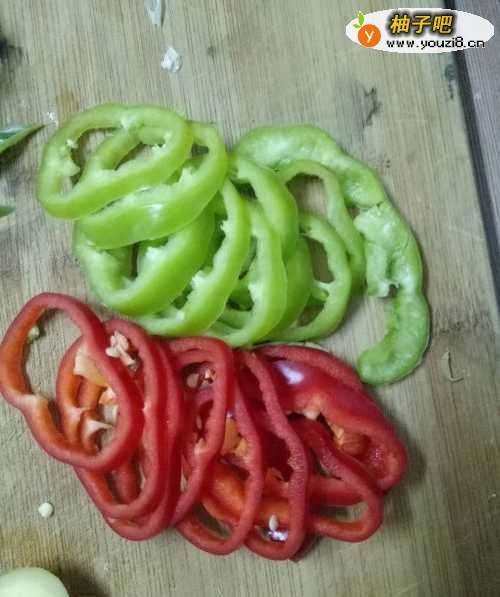 7然后放入青椒红椒圈煮,待青椒红椒圈断生后开始收汁