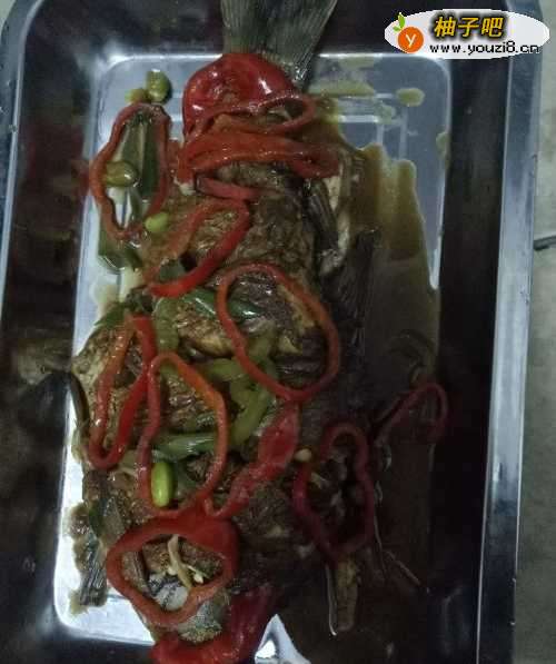 8收汁到差不多的程度时,然后起锅,先将鱼装入盘中,然后将辣椒圈,毛豆依次放到鱼上面